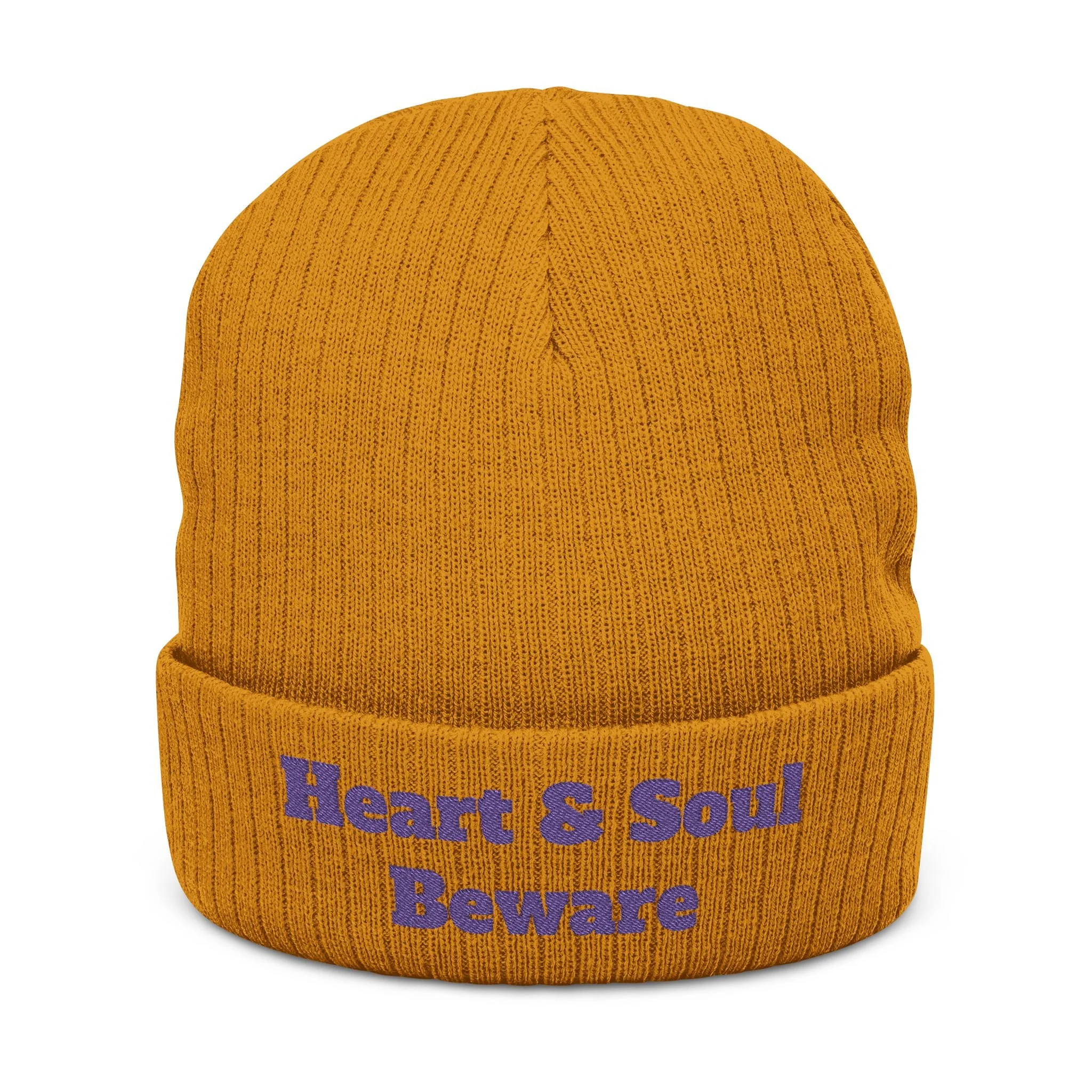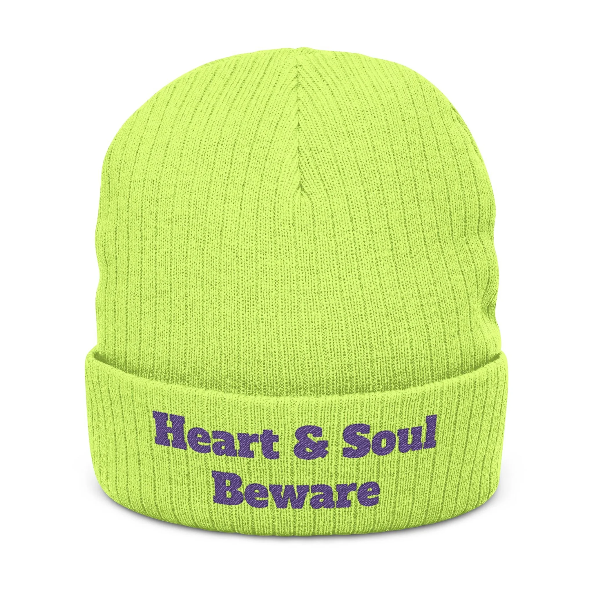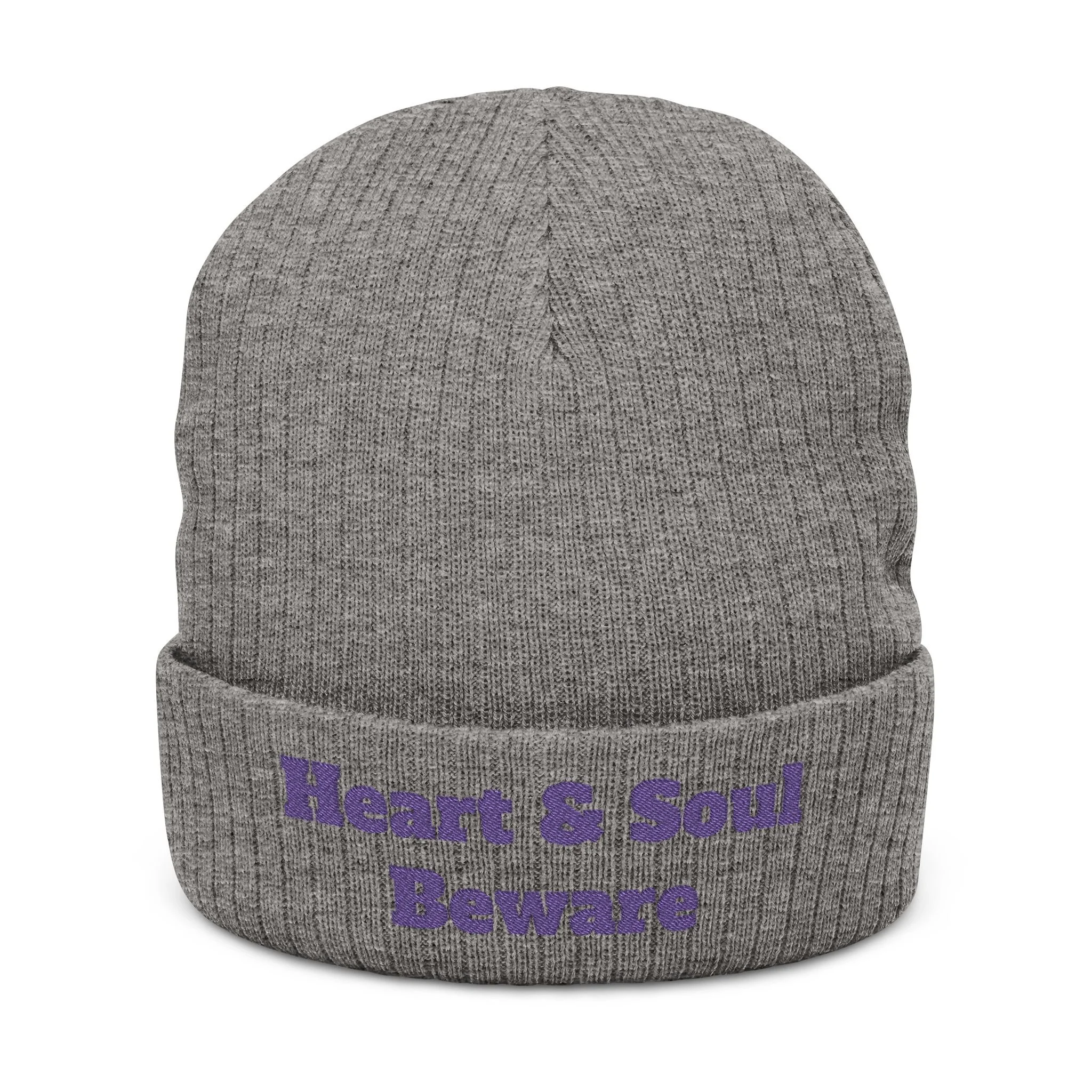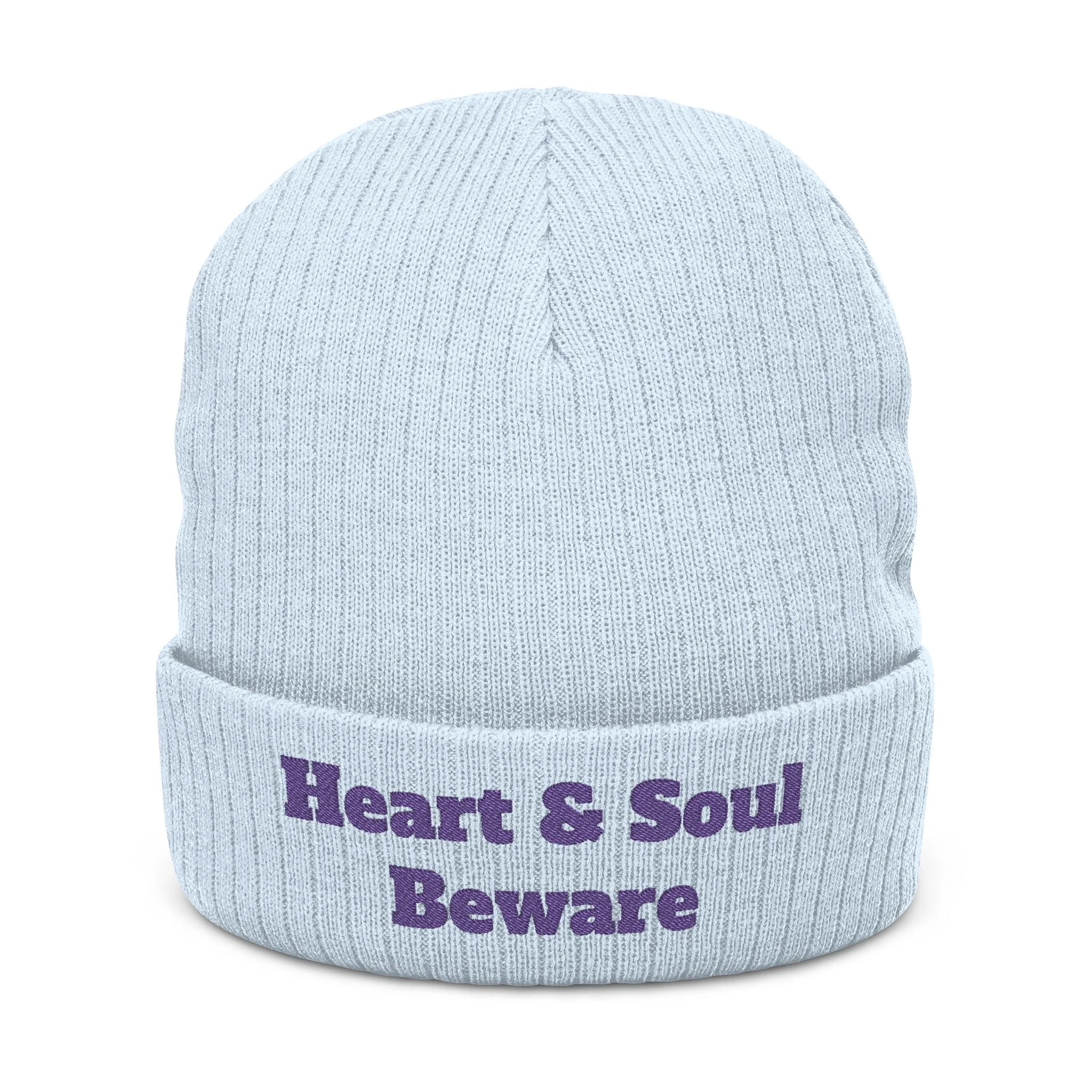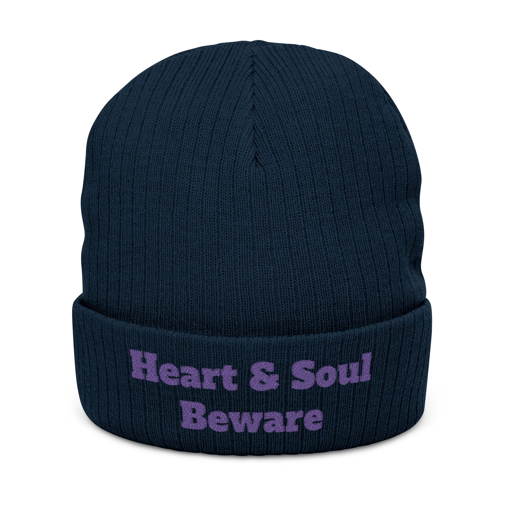 Embroidered 'Heart & Soul Beware' Ribbed Beanie - Cozy Knit Winter Hat - Purple