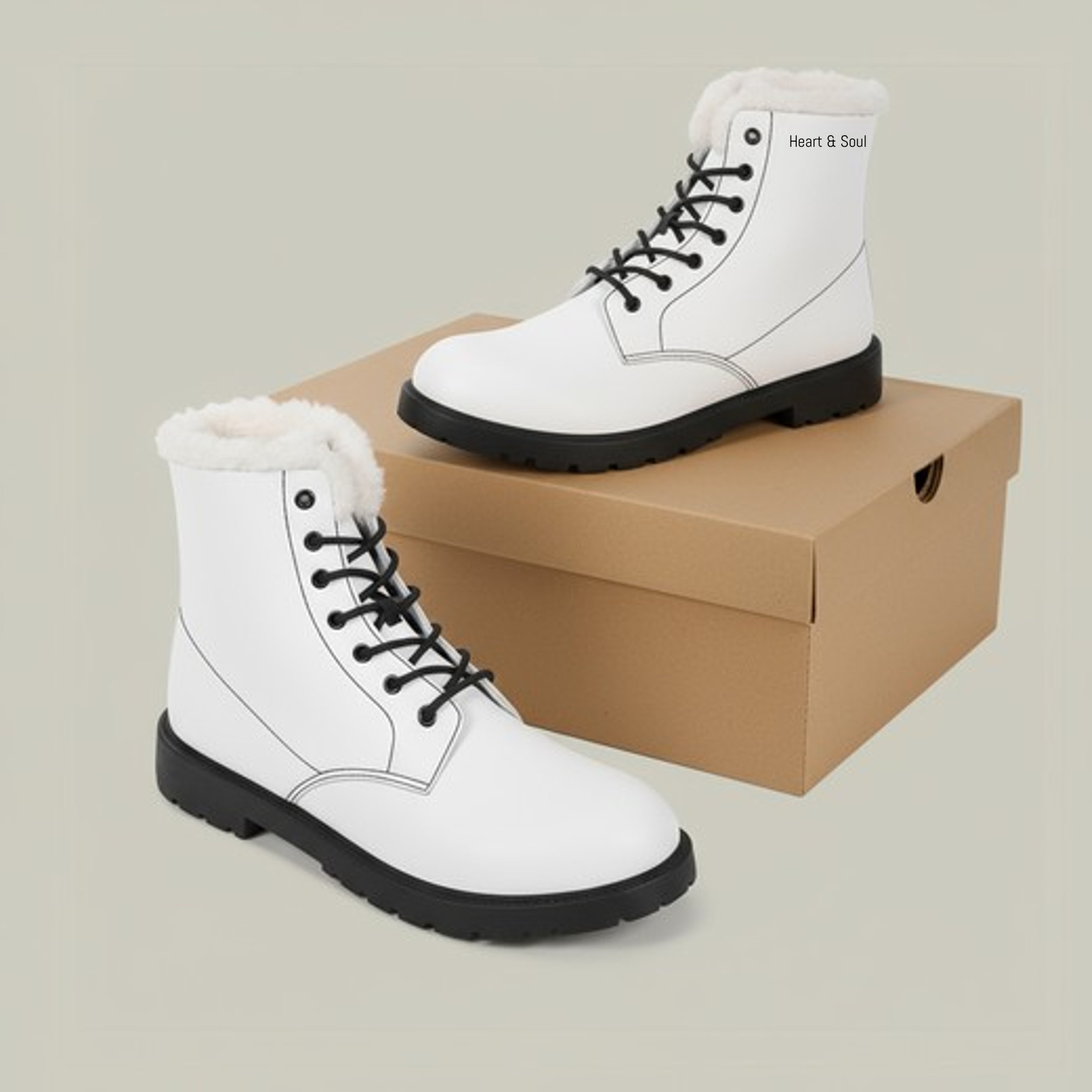 The outer microfiber leather reflects discipline and protection, while the inner fleece lining speaks of grace and warmth. A subtle insignia of Heart and Soul Beware near the heel marks every step as a reminder: courage is not loud, but lasting. Whether for daily wear or purposeful moments outdoors, these boots balance resilience, reflection, and refined style.