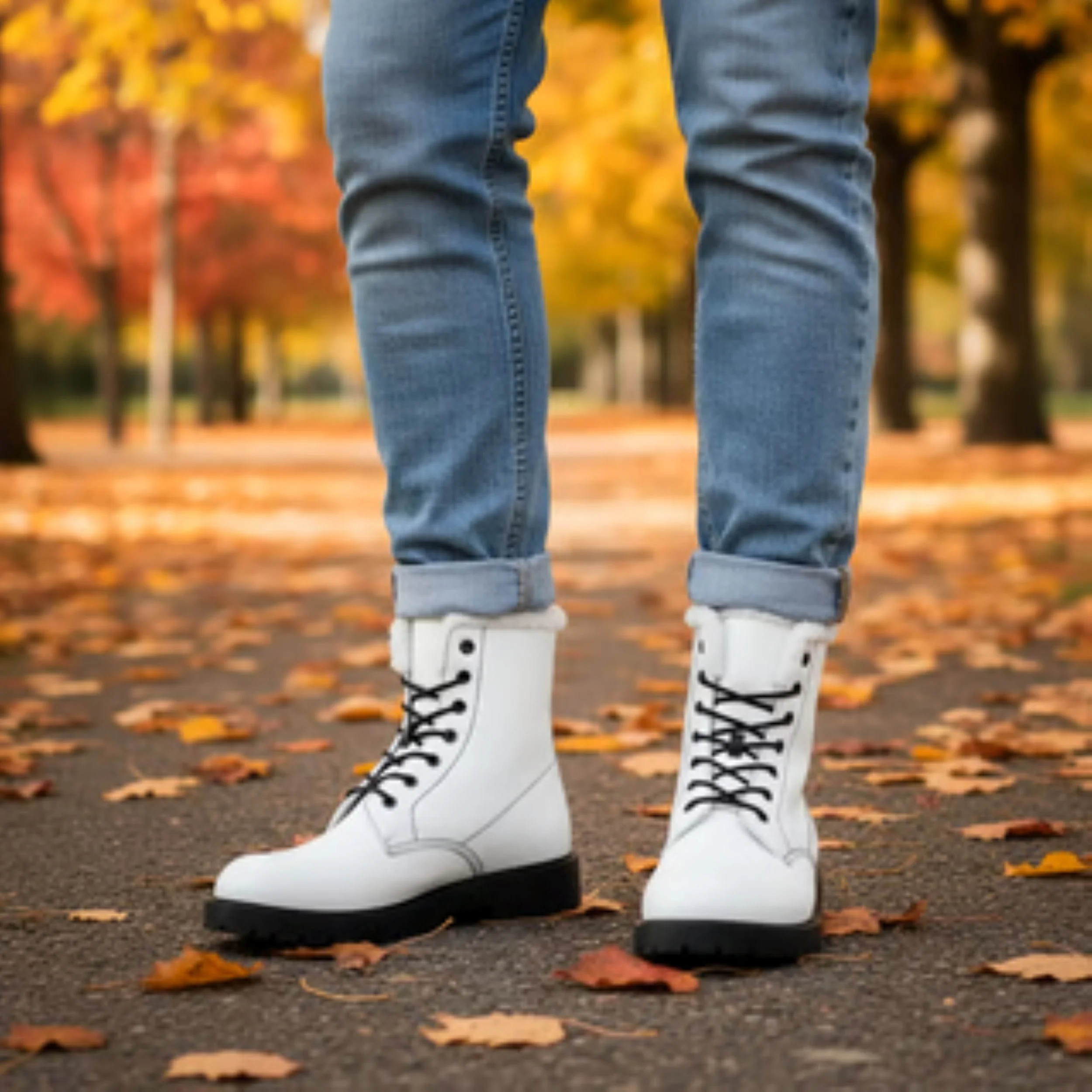 Pair these white boots with charcoal denim and a neutral knit sweater for a balanced, modern look. Or, for an elevated edge, match them with black trousers and a winter overcoat—let the insignia peek through as a quiet mark of identity.