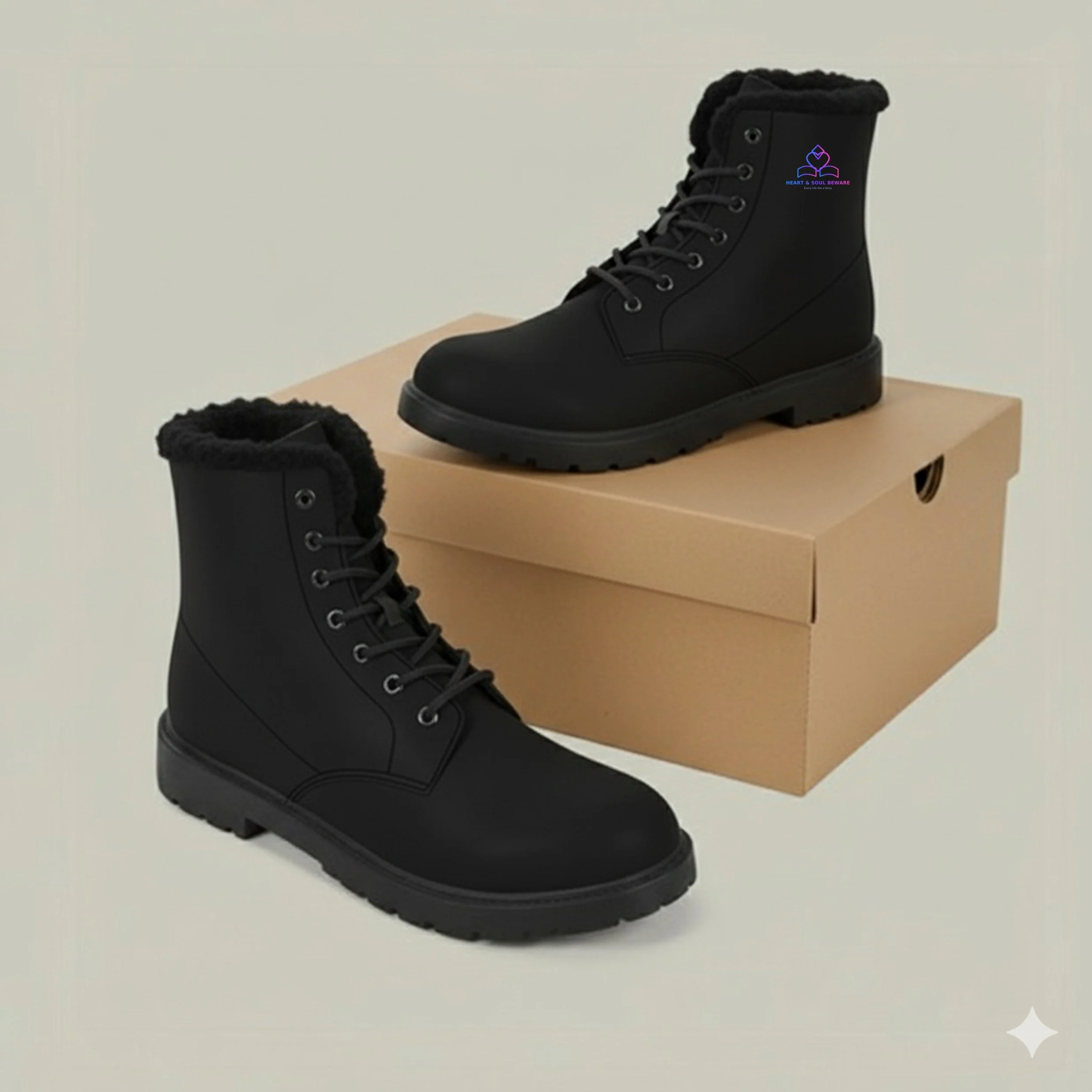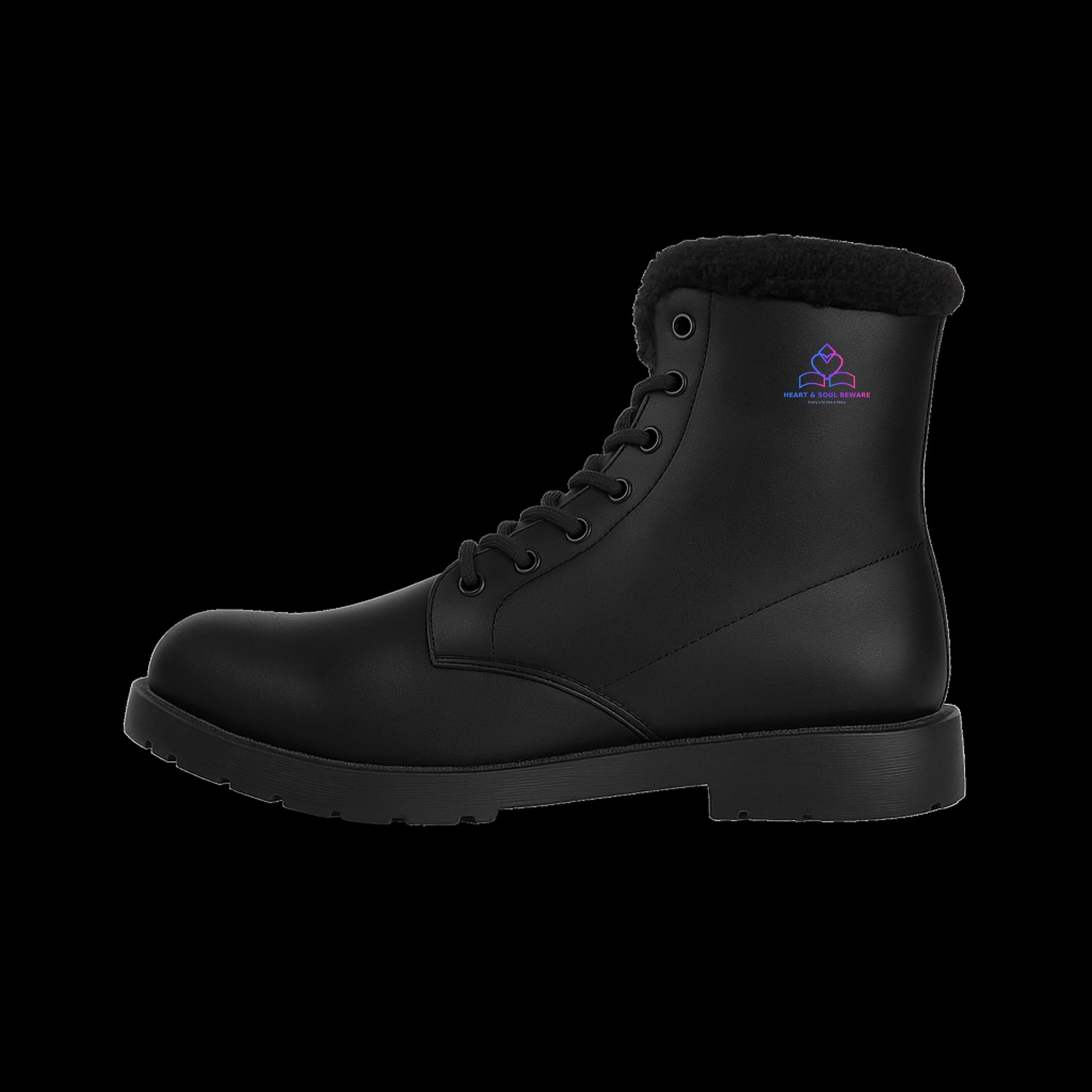 The matte black microfiber leather exterior stands for endurance and protection, while the plush fleece interior embodies warmth and care. Each pair features the Heart & Soul Beware “Every Life Has a Story” insignia—an emblem of grounded resilience and inner clarity. These boots are crafted for balance: steady enough for the journey, refined enough for reflection.