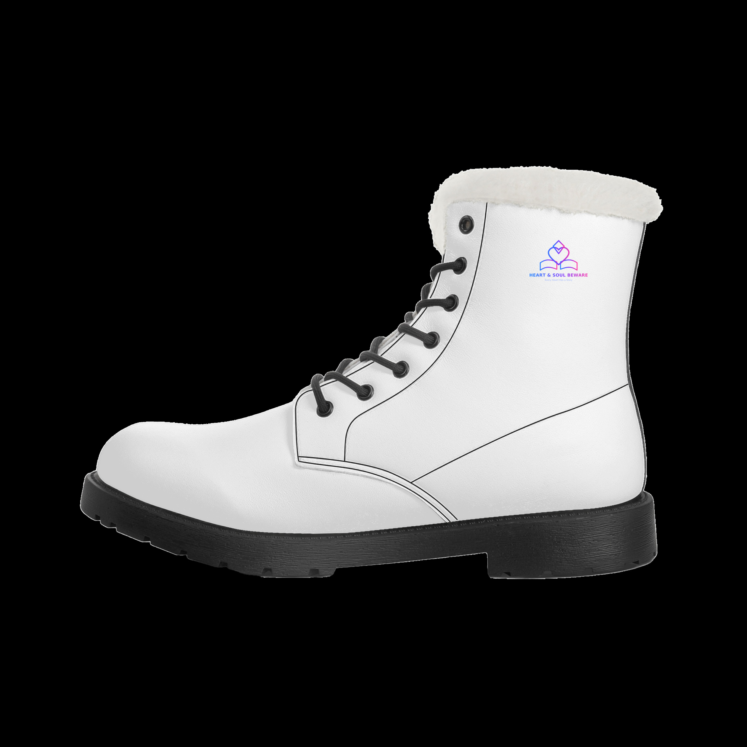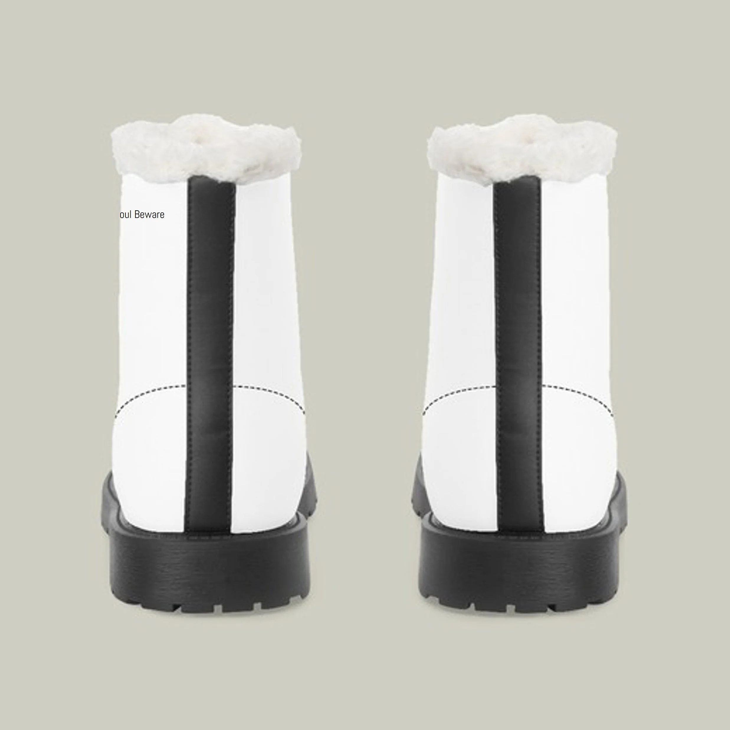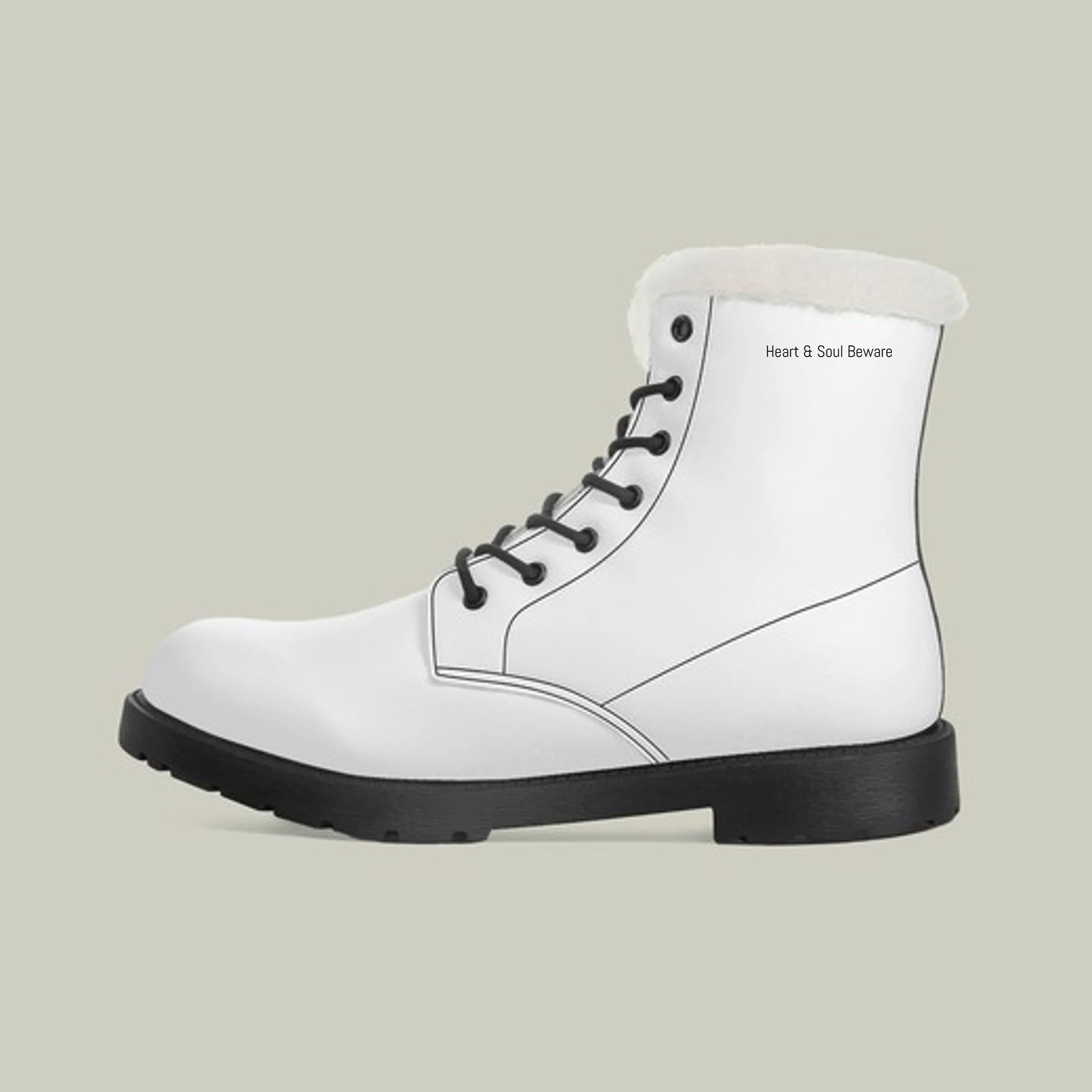 The smooth white microfiber leather exterior pairs with a plush fleece interior for steady warmth and comfort. The Heart & Soul Beware emblem rests subtly on the upper side panel—your quiet reminder that resilience is its own kind of beauty. Designed for daily wear, reflective walks, or bold winter styling, these boots are both statement and sanctuary.