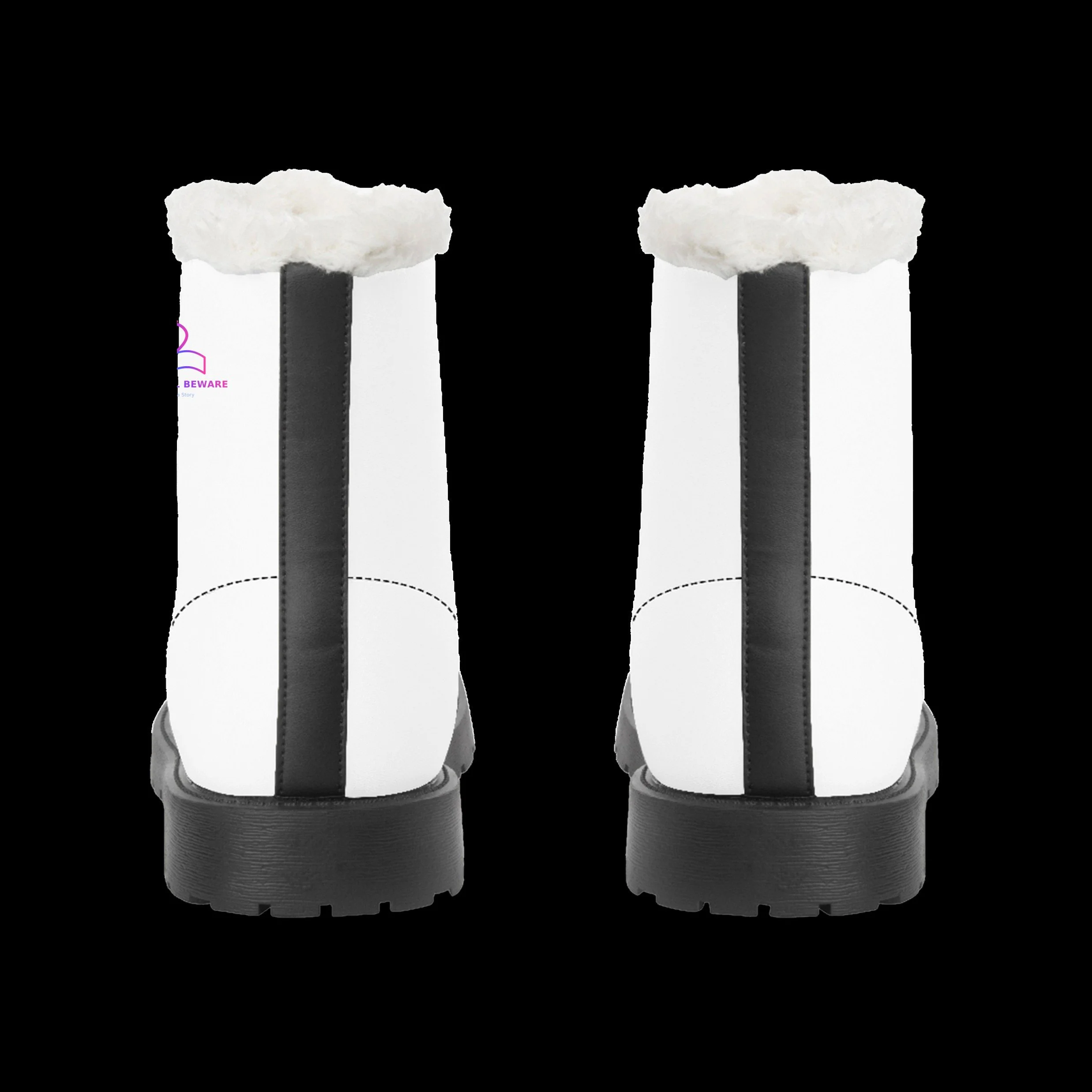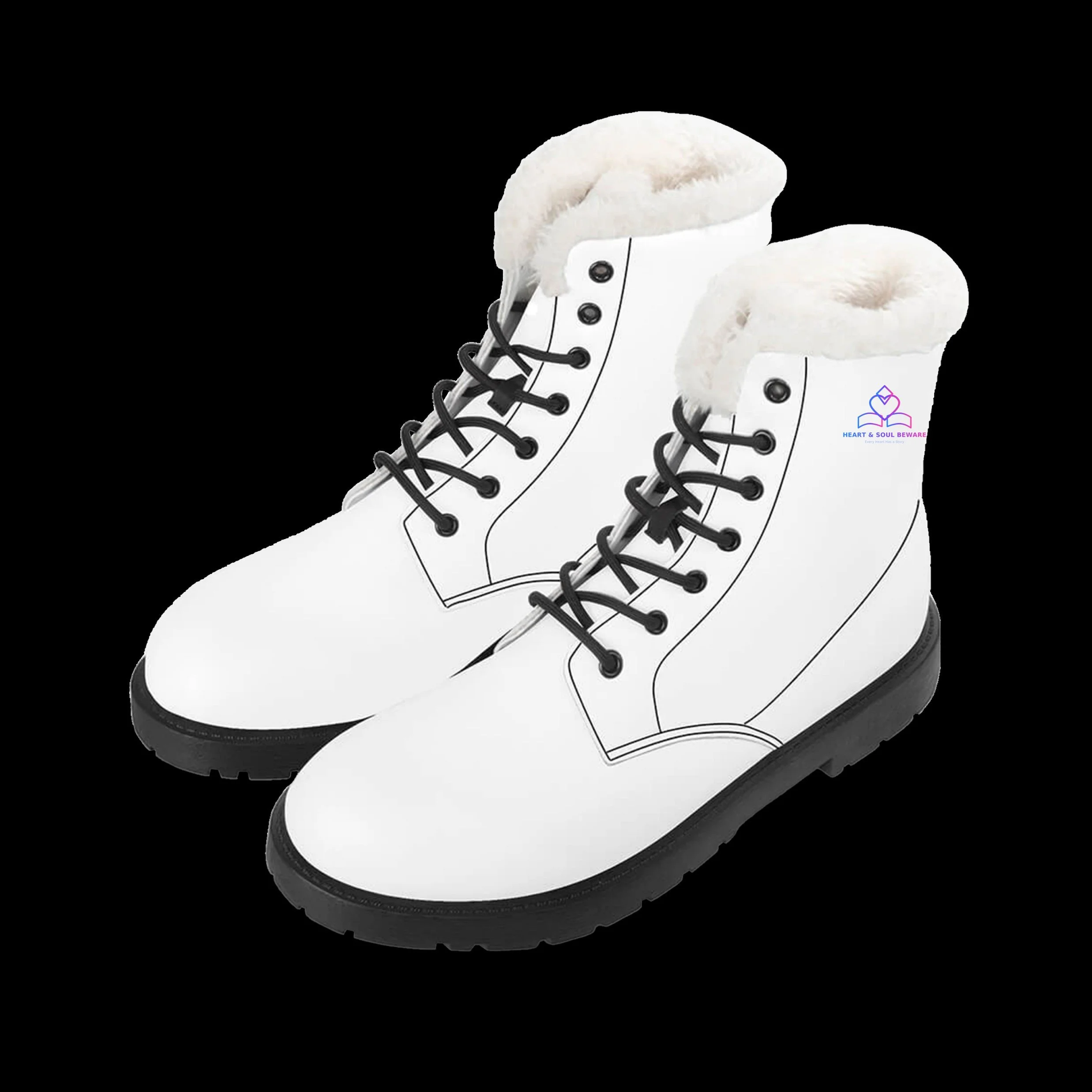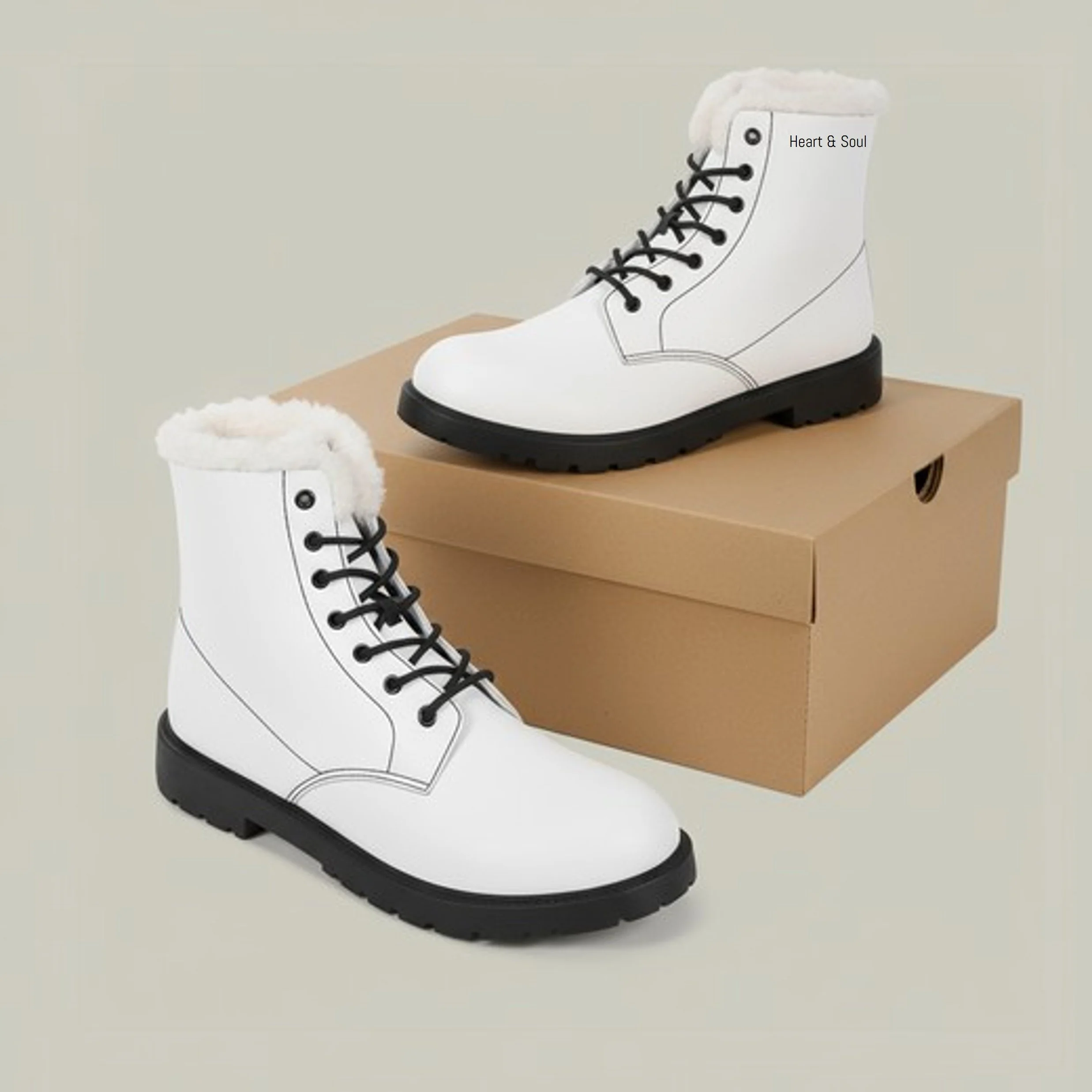 The smooth white microfiber leather exterior pairs with a plush fleece interior for steady warmth and comfort. The Heart & Soul Beware emblem rests subtly on the upper side panel—your quiet reminder that resilience is its own kind of beauty. Designed for daily wear, reflective walks, or bold winter styling, these boots are both statement and sanctuary.