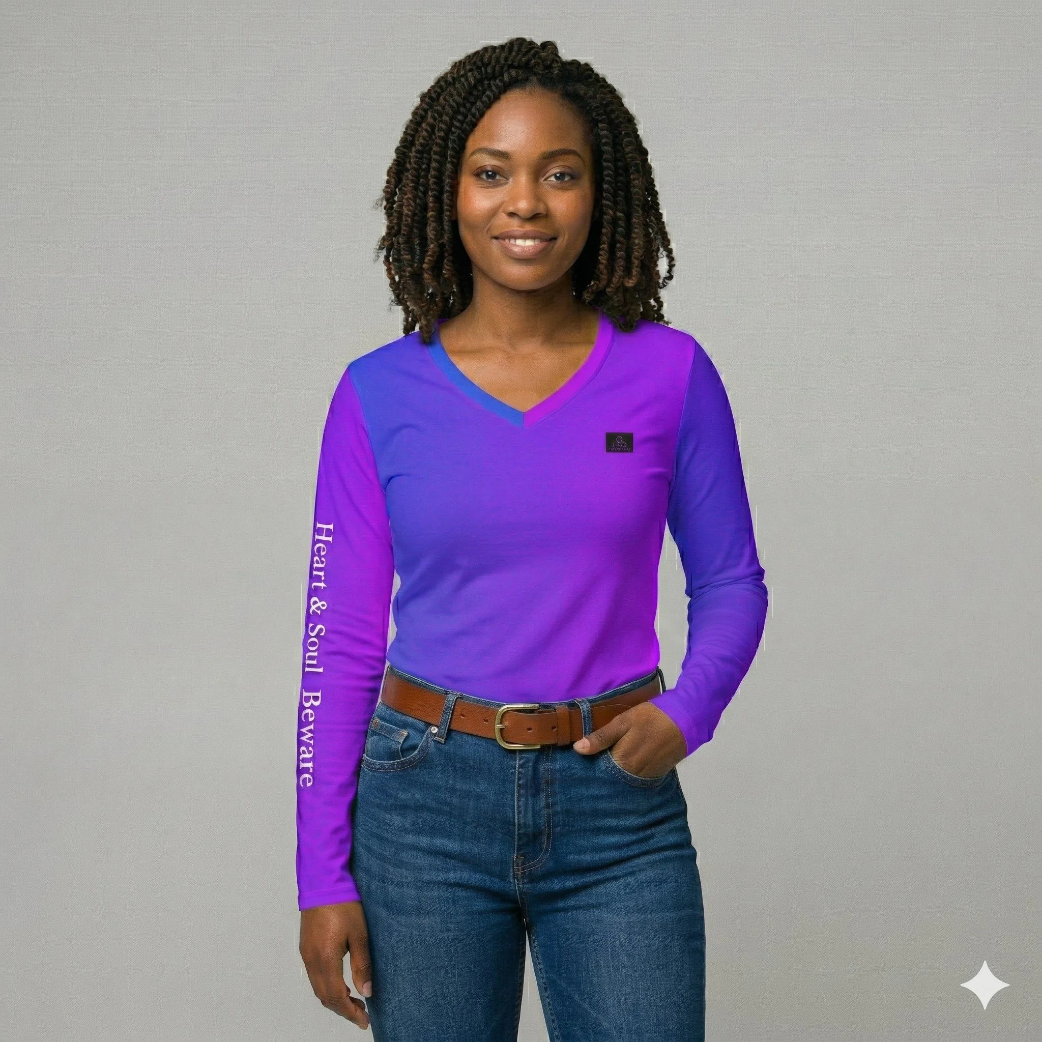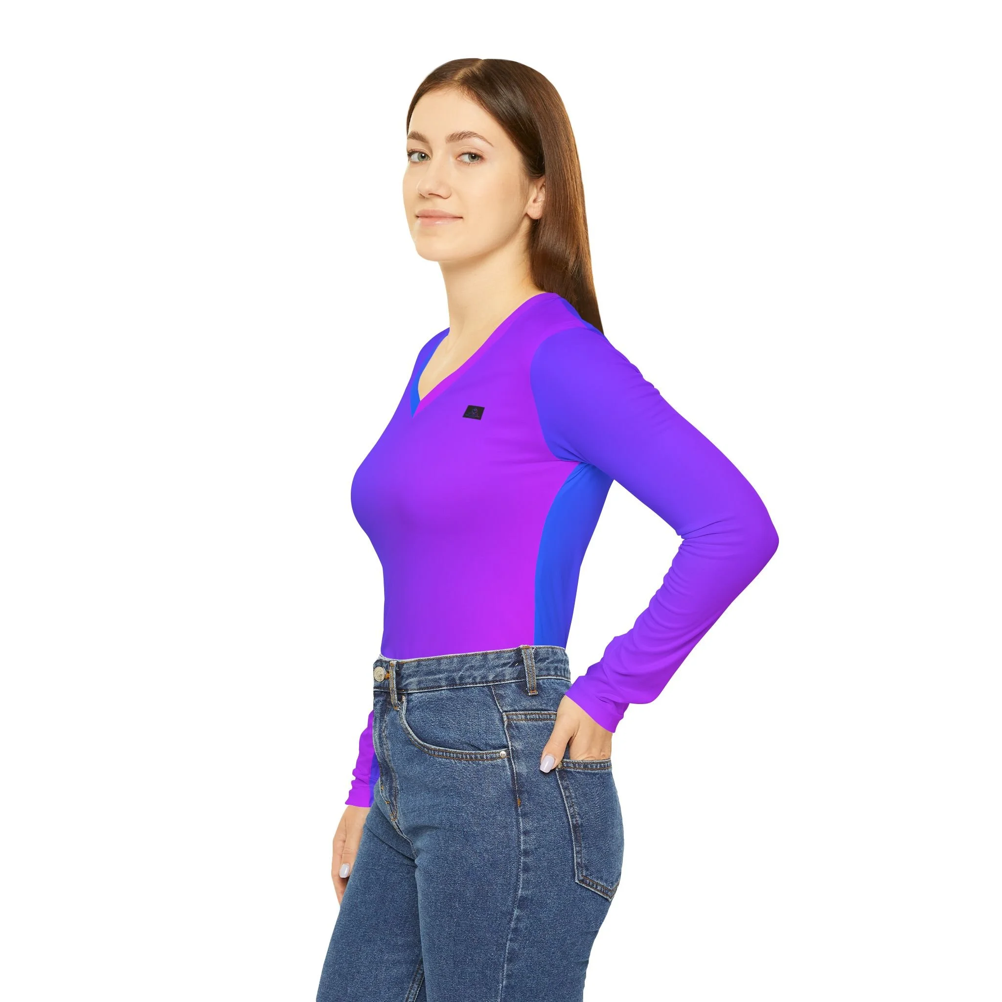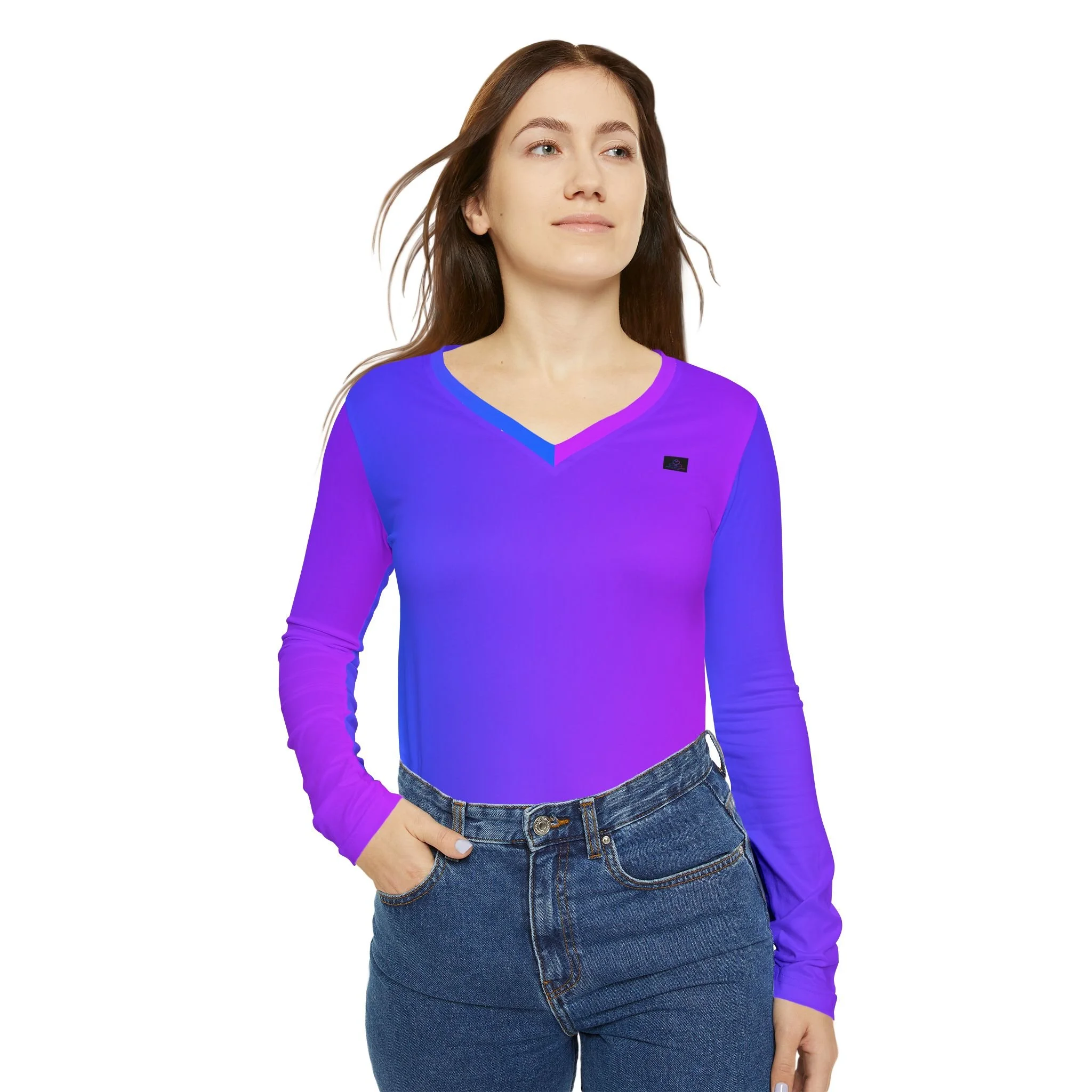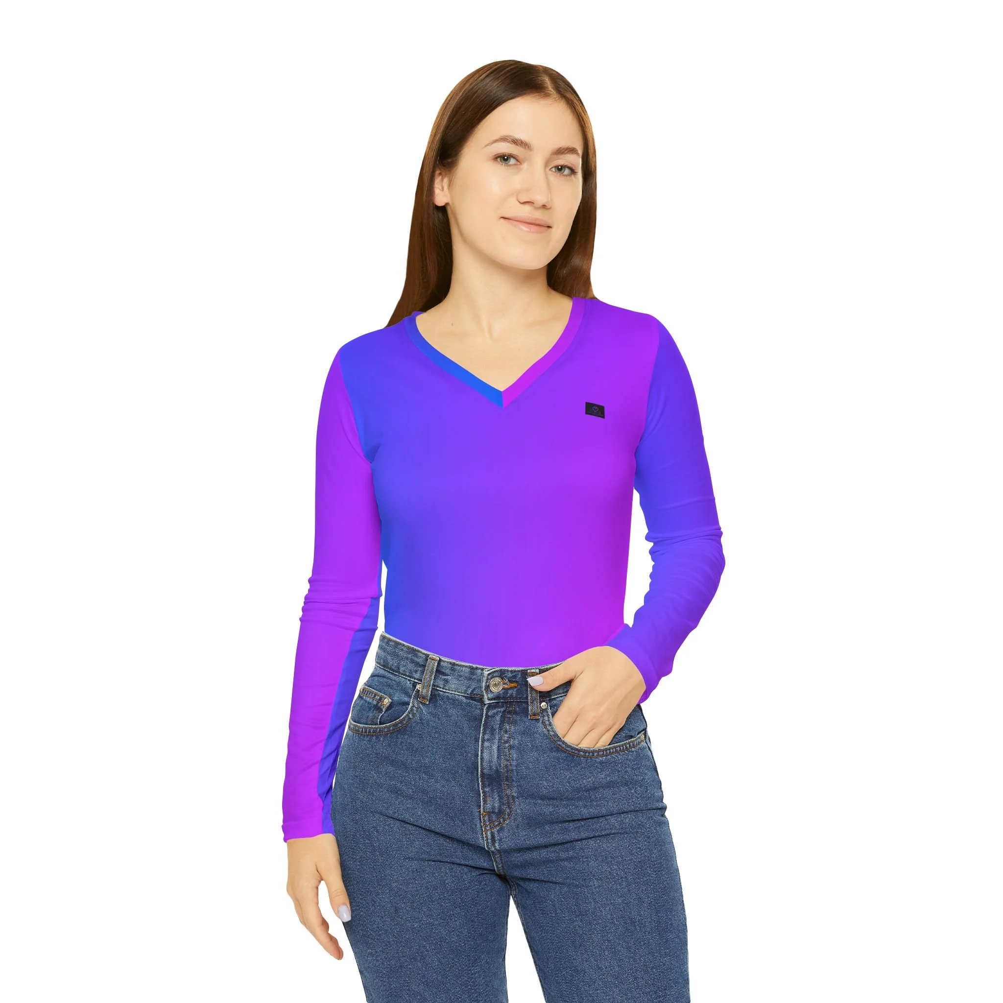 Awareness in every movement. The Signature "Presence" Long-Sleeve V-Neck is a refined staple for the intentional observer. Designed to drape like a second skin, this piece combines the vibrant purple-to-blue gradient of our signature collection with an understated, relaxed silhouette.